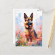 Arte de acuarela colorida de un pastor alemán sentado en un campo de flores de primavera.