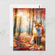 Postcard cuenta con arte acuarela de un zorro alerta en un bosque en la temporada de otoño con hojas de otoño que lo rodean. Un retrato de colores cálidos con naranjas, rojos, amarillos y marrones, con el sol brillando a través de los árboles. ¡Perfecto para la temporada de otoño!