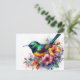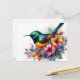 Postcard cuenta con obras de arte acuáticas de un pájaro dorado de cola verde. Vibrante arte de retratos florales de pájaros multicolor. Gran espacio de borde blanco alrededor del diseño con la pintura colorida en el medio.