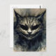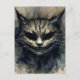 Postcard cuenta con acuarela felina de un gato de aspecto siniestro en tonos neutros y oscuros. ¡El gato malvado recuerda al misterioso y sonriente gato de Cheshire de la obra maestra clásica de literatura infantil de Lewis Caroll, Alicia's Adventures in Wonderland! Fantástico para Halloween o en cualquier momento, para los fans de gatos y sombras.