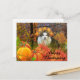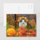 Si te gustan los gatos, entonces vas a adorar esta tarjeta postal de vacaciones de Acción de Gracias. Esta tarjeta presenta uno de mis diseños de arte de collage. El fondo es una de mis fotografías originales de árboles de otoño en Arkansas, luego agregué un recorte de un gato blanco y una superposición de plumas de pavo, calabazas y hojas de temporada. Hay un saludo de "Feliz Día de Acción de Gracias" que puedes cambiar a otro texto. Esta tarjeta postal de Acción de Gracias es adorable y hará sonreír a todos.
