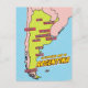 Este mapa ilustrado de Argentina está representado en un estilo vibrante de arte pop. El mapa está delineado en negro y relleno con un color amarillo brillante, sobre un fondo azul con un patrón punteado. Las principales ciudades de Argentina están etiquetadas en cajas azules.