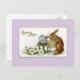 Este conejito artístico marrón es pintura, flores y pollitos amarillos, en un huevo de Pascua azul. La paleta del pintor está salpicada de pintura y un ramo de lirios blancos sobre el suelo. Saludo: Joys de Pascua. Imagen de una postal vintage de Pascua en un hermoso fondo de lavanda.