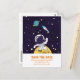 Tarjeta de guardar la fecha con fondo azul oscuro con estrellas amarillas esparcidas alrededor. Superpuesta en la parte superior hay una ilustración de un astronauta que lleva un traje de astronauta blanco flotando sobre la luna. Saludando con la mano mientras explora el espacio. A lo lejos hay un planeta con anillos y una nave espacial que vuela hacia el espacio.