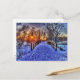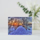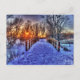 Una fotografía asombrosa de un puente cubierto de nieve con la puesta de sol a través de los árboles.