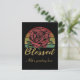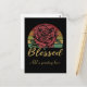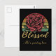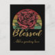 Envía esta tarjeta postal de estilo vintage con tu propio mensaje personalizado en la parte delantera y trasera. Cuenta con una rosa roja clásica frente a un fondo de atardecer retro angustiado y la palabra "Bendita" en fuente dorada.