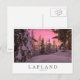 Foto postal de un cielo rosado durante una puesta de sol sobre los abetos cubiertos de nieve en un bosque en Laponia, al norte de Finlandia en invierno con un borde blanco y el texto 'Laponia, Finlandia'.