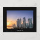 Postal de una colorida puesta de sol sobre el horizonte con los rascacielos en la Cornisa en el centro de la ciudad de Doha, capital del país del Golfo Qatar con una frontera blanca y el texto: 'Doha'.