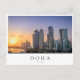 Foto postal de una colorida puesta de sol sobre el horizonte con los rascacielos en la Cornisa en el centro de la ciudad de Doha, capital del país del Golfo Qatar con un borde blanco y el texto 'Doha, Qatar'.