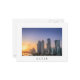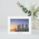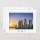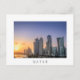 Postal de una colorida puesta de sol sobre el horizonte con los rascacielos en la Cornisa en el centro de la ciudad de Doha, capital del país del Golfo Qatar con una frontera blanca y el texto: 'Qatar'.