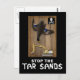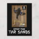Un monte de pato con un pato mallard aceitado y muerto, equipo para mover la tierra, y un cráneo y huesos cruzados. También aparece un texto que dice "DETENGAN LAS ARENAS DE TAR". Lástima de cualquier ave acuática que desembarque en un estanque de relaves tóxicos en Alberta donde se extrae un petróleo extremadamente viscoso de las arenas de alquitrán (también conocido como arenas de petróleo) con horribles efectos ambientales. Las arenas alquitranadas de Alberta consisten en petróleo crudo pesado mezclado con arena, arcilla y betún. La extracción implica quemar gas natural para generar suficiente calor y vapor como para derretir el petróleo de la arena. Se necesitan hasta cinco barriles de agua para producir un solo barril de petróleo. Cada día millones de galones de agua están contaminados con químicos, incluyendo arsénico, cobre, plomo y zinc, para separar básicamente el aceite de arenas alquitranadas (llamado betún diluido) de la arena. Pero el agua está tan contaminada después de este proceso que tienen que almacenarla en lodos tóxicos llamados estanques de relaves. Se estima que cada día se filtran 3 millones de galones de agua contaminada desde estanques de relaves hasta el río Athabasca de Alberta, y el paisaje circundante. Por favor, di que no a las arenas alquitranadas.
