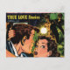 Historieta romántica vintage que muestra a un par de personas abrazándose fuertemente en un auto. Miran sobresaltados cuando la policía les muestra brillantes faroles
