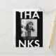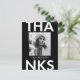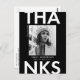 Moderna y de moda, gracias a tu postal con la foto del graduado con "Gracias" en negrita con letras blancas y fondo negro. Personalice la parte delantera de la foto graduada gracias a la tarjeta postal agregando el nombre del graduado, el nombre de la escuela y el año de graduación. En la parte posterior de la tarjeta de agradecimiento de la foto de graduación aparece su dirección de retorno con espacio para su mensaje escrito a mano o con tipeo.