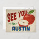 A charming Austin Texas vintage travel postcard featuring a lovely red apple, along with fun retro style text that says, "See you in Austin"