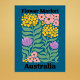 Celebrate the breathtaking and unique flora of the Land Down Under with this vibrant Australia Flower Market design. This modern illustration features a lush, eclectic arrangement of golden orb-like clusters, delicate pink wildflowers, and bold purple protea-style blooms.