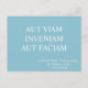 Una postal motivacional con la cita latina 'aut viam inveniam aut faciam' que se traduce como ‘encontraré una manera o la haré’. Estas palabras se atribuyen a Hannibal, un comandante militar del antiguo Cartago, uno de los mayores adversarios de Roma. Se dice que fue la respuesta de Hannibal cuando sus generales expresaron sus dudas acerca de su plan de marchar sus tropas, incluyendo la caballería y los elefantes de guerra, a través de los Alpes para atacar Roma desde el norte. La frase 'aut viam inveniam aut faciam' le animará a superar los obstáculos que se interponen en su camino. La letra de la frase latina tiene un toque clásico que evoca inscripciones públicas romanas y la traducción al inglés está en un tipo de letra opuesto. La postal tipográfica presenta texto blanco crudo sobre un fondo azul turquesa.
