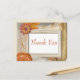 Otoño Gracias postcard presenta un bonito diseño de naranja con temática de otoño. "Gracias" está escrito en medio de una imagen gráfica de marco de madera. La parte trasera tiene un fondo beige. ¡Añadir al carro hoy! Diseño de RSVP: WeddingsbyRhoadie Obra artística temática de otoño en el frente: Oberholster Venita