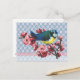 Un magnífico pájaro azul con el pecho amarillo dorado sobre una rama de flor de cerezo rosa. Este ilustracion vintage aporta colores llamativos y detalles naturales. En el fondo, el azul y el rosa claro están adornados con un encaje rosa. Perfecto para animales, cerezos y amantes de la naturaleza.