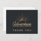 Una tarjeta postal de agradecimiento con una ilustración de color dorado sobre un fondo negro-gris. Diseñada con una ilustración de una montaña con los rayos del sol brillando hacia afuera desde detrás. La tipografía dice: Aventura explorar soñar descubrir.