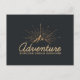 Postal con ilustracion de color dorado sobre fondo negro-gris. Diseñado con un ilustracion de montaña con los rayos de sol brillando hacia afuera desde atrás. La tipografía dice: "Aventura explorar el descubrimiento de los sueños".