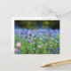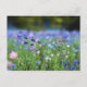 Campo de flores de maíz en tonos azules, púrpura, lavanda y rosa profundos y pálidos, con hojas verdes pálidas.