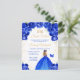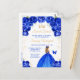 Esta elegante y glamurosa invitación de cumpleaños para sweet sixteen presenta a una bella princesa con cabello rubio con un vestido de gala azul real. El texto combina letra manuscrita y fuentes modernas sans serif para un aspecto clásico y sofisticado. Los arreglos florales, la mariposa y el confeti dorado crean la mezcla perfecta de rústico y chic.