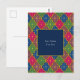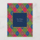 Este diseño de postal celestial tiene tu mensaje personalizado en un cuadrado azul oscuro rodeado de un diseño de azulejos marroquíes multicolores. Recortado con una celosía dorada y lunas y estrellas, tu mensaje será entregado con un estilo elegante. Escribe un mensaje más largo y la dirección de envío en el reverso o déjalo en blanco para escribir a mano. Esta postal es una forma conveniente y económica de mantenerse en contacto con amigos, familiares y clientes.