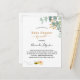 Para un Baby Shower por correo. Un fondo blanco moda. Decorada con vegetación eucalipto, deja una falsa estampilla de oro y una linda y sonriente abeja con un sobre. Personalice y agregue un nombre y detalles del fiesta. Letras negras y doradas. El texto: Baby Shower y el nombre de la madre a ser están escritos con una escritura de estilo con letras a mano moderna. Neutralidad de género. Atrás: diseño postal. Sugerencia: Si no desea que se vea como una postal, haga clic en personalizar, vaya a la parte posterior y quite el separador y el sello postal.