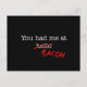 Tanto si eres amante del tocino como si eres gourmet, este diseño baconizado te transportará a un estado crujiente, crujiente, delicioso, graso y bacony de felicidad extrema. Comience su propio club de tocino del mes con estos deliciosos regalos de tocino como camisetas de tocino femenino, camisetas de tocino masculino, camisetas de tocino infantil y sudaderas de tocino. Envíe regalos de tocino a todo aquel que ame el tocino. ¡Regale un dulce dulce y compre un regalo de tocino todos los meses! Haz una camiseta de tocino, corbata de tocino, jarra de tocino, gorra de panceta, almohadilla de ratón de tocino, bolsa de tocino, llavero de tocino, calcomanía de parachoques de tocino, camisa de perro de tocino o parte de la canasta de regalo de tocino. Envíe una tarjeta postal de tocino o tarjeta de felicitación de bacon a su amigo para que comparta sus viajes de tocino. Los bacontarianos son salados, suaves y sensuales. Muestra al mundo tu adicción al tocino con una camiseta de tocino, regalos de tocino, estuche para iPhone de tocino, estuche para iPad de tocino o patatas de tocino. El tocino es un dulce para el hombre, el tocino es caramelo, el panceta es barbacoa. Me encanta el tocino. El tocino lo hace todo mejor. ¡Compra bacon ahora! Descripción de la imagen: un diseño en blanco y negro con las palabras "me tenías con hola", con la palabra "hola" tachada y la palabra "tocino" sustituida por "dorado" en rojo.