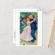 Postal con el bonito cuadro impresionista de arte, Dance at Bougival (1882), del artista francés Pierre-Auguste Renoir. Una pareja romántica bailando en un fiesta. El hombre está vestido con un traje azul y un gorra, mientras que la mujer está vestida con un vestido rosado y espumoso y una gorra roja.