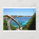 Una hermosa vista panorámica en la cima de la colina, antes de bajar a la pintoresca playa de Menorca, España. Esta es una de las Islas Baleares. Agua azul clara, hojas verdes y un cielo soleado.