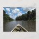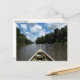 Un bote lanza una nariz por un río en la selva amazónica bajo nubes esponjosas en un cielo azul.