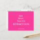La postal "Calva y Bodaciosa" sobre el cáncer de mama en rosa caliente, de Illustrator y caricaturista April McCallum. Leyenda: "Calvo. Valiente. Hermoso. Bodacioso" y "¡Chica!" Personalizados y expresiones provocativas y suaves. "Creando cejas y haciendo impresiones" para la toma de conciencia sobre el cáncer de mama.