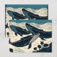 Una ilustración de linocut de estilo vintage de tres ballenas azules bajo el mar, inspirada en la Bahía de Fundy en Nueva Escocia.