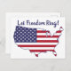 Tarjeta postal con la imagen de los Estados Unidos continentales superpuesta con la bandera estadounidense roja, blanca y azul. El texto dice, "Dejen que la libertad suene."
