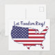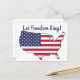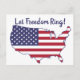 Tarjeta postal con la imagen de los Estados Unidos continentales superpuesta con la bandera estadounidense roja, blanca y azul. El texto dice, "Dejen que suene la libertad".