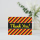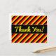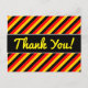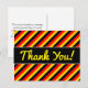 Este diseño de postal presenta un patrón de rayas (o líneas) de color negro, rojo o amarillo. Estos colores se inspiraron en los de la bandera nacional de Alemania. Este podría ser un gran regalo para alguien de Alemania, o incluso para alguien que realmente le guste mucho el país de Alemania. También muestra el mensaje de agradecimiento "¡Gracias!" en el frente en un texto similar al de un guión amarillo, junto con un mensaje personalizado de gratitud en la parte de atrás.