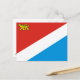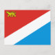 Postal con bandera de Primorsky krai, bandera con tricolor diagonal de rojo, blanco y azul, con carga de tigre siberiano en el campo rojo