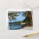 Postal de los tradicionales y coloridos barcos turísticos en el lago Bled bajo un castaño en colores otoñales en un paisaje otoñal en Eslovenia con un borde blanco y el texto: "Eslovenia", un poco rotado como si estuviera suelto.