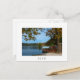 Postal de los tradicionales y coloridos barcos turísticos en el lago Bled bajo un castaño en colores otoñales en un paisaje otoñal en Eslovenia con un borde blanco y el texto: 'Bled'.
