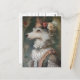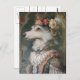 A noble dog, possibly a terrier mix or chihuahua, is positioned centrally within a vertical portrait frame. The dog has light brown fur, expressive eyes, and wears an elaborate gold crown and a lavish white ruffled collar. It is dressed in a rich, dark blue coat adorned with gold trim and a patterned sash, indicative of Baroque royal fashion. The background is dark, rich, and features subtle patterned embellishments. The artwork is rendered in a highly detailed, painterly style, utilizing soft lighting to emphasize the textures of the fur and the intricate regalia. The overall atmosphere is elegant, charming, and whimsical.