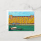 Postal de un colorido y estilizado cuadro del majestuoso edificio Kaserne (ex ejército suizo) de Basilea a lo largo del Rin con coloridas trenza otoñal y el pequeño hada del Rin de Vogel Gryff que cruza el Rin de Grossbasel a Kleinbasel.