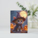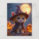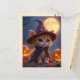 Un lindo gatito con un traje de bruja para Halloween. Las calabazas varían en tamaño y brillan con una suave luz naranja. El ambiente es acogedor y nocturno. ¡bonito, tarjeta personalizado de Halloween para todos!