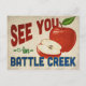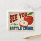 Una encantadora tarjeta postal de viaje de Battle Creek de Michigan con una hermosa manzana roja, junto con un divertido texto de estilo retro que dice "Nos vemos en el Creek de la Batalla"