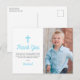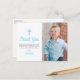 Agradezca a su familia y amigos por asistir al primer cumpleaños y bautizo de su bebé con una foto de su hijo. El diseño azul presenta lunares blancos sobre un fondo de acuarela azul en la parte posterior de la tarjeta. Todo el texto se puede personalizar, incluyendo el nombre de su hijo y el mensaje.