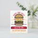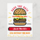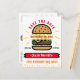 Anuncie su fiesta de cumpleaños BBQ a la familia y amigos con esta postal de invitación personalizado adecuada para todas las edades, con un gráfico moderno de una hamburguesa con llamas en rojo, amarillo naranja, marrón y negro sobre un fondo blanco con tipografía colorida en negrita. Personalízalo con todos los detalles que necesitas para invitar a tus invitados, incluyendo el nombre, edad, día, fecha y ocasión en la portada e información adicional con las direcciones y detalles del RSVP en la parte posterior. Diseñado por © Tim Coffey.