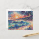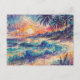 The beach with a glowing sun in the background in a "scribbles" art style. This unique artwork uses energetic lines and vibrant washes of color to create a dynamic impression of a tropical beach. Palm trees sway, waves crash, and the sun sets in a burst of abstract expression. The loose, spontaneous style gives the piece a fresh and lively feel. Loose, dynamic brushwork and a rich palette of blues, greens, oranges, and purples evoke the feeling of a warm breeze and the rhythmic crash of waves. The scene is capturing the fleeting beauty of a sunset over the ocean. A perfect piece for those who love the coast and or expressive art.
