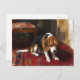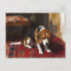 Una maraña sobre una alfombra de colores vivos y textura en una habitación poco iluminada. El beagle tiene la cabeza baja, capturando un momento de introspección o tal vez tristeza. El conjunto es abstracto, con tonos cálidos y tierra dominando el fondo, lo que aporta un toque melancólico a la escena.