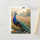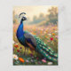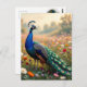 A beautiful illustration of a blue, green and turquoise peacock in a field of meadow of flowers. A beautiful postcard to keep in touch with friends and family and say hi!