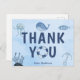 Tarjetas de agradecimiento para baby shower de playa encantadoras. Tarjeta postal de agradecimiento con temática de animales del océano en acuarela azul con un salvavidas náutico como la O en USTED. Animales costeros encantadores rodean su mensaje personalizado, incluyendo una ballena y un pez bajo el mar.